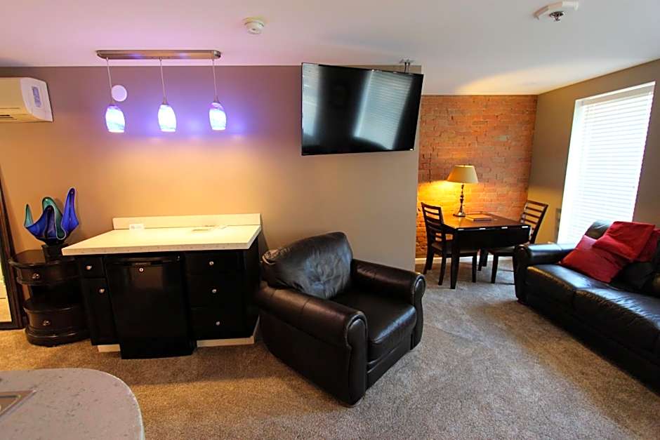Guests will have a special experience as the studio provides a fireplace. Providing free toiletries, this studio includes a private bathroom with a bath and a hairdryer. The studio's kitchenette, which has a refrigerator and a microwave, is available for cooking and storing food. The studio features carpeted floors, a seating area with a flat-screen TV with cable channels, air conditioning, a tea and coffee maker, as well as a dining area. The unit offers 2 beds.